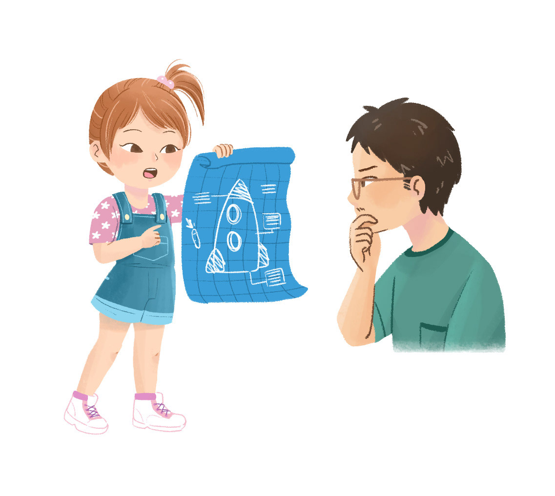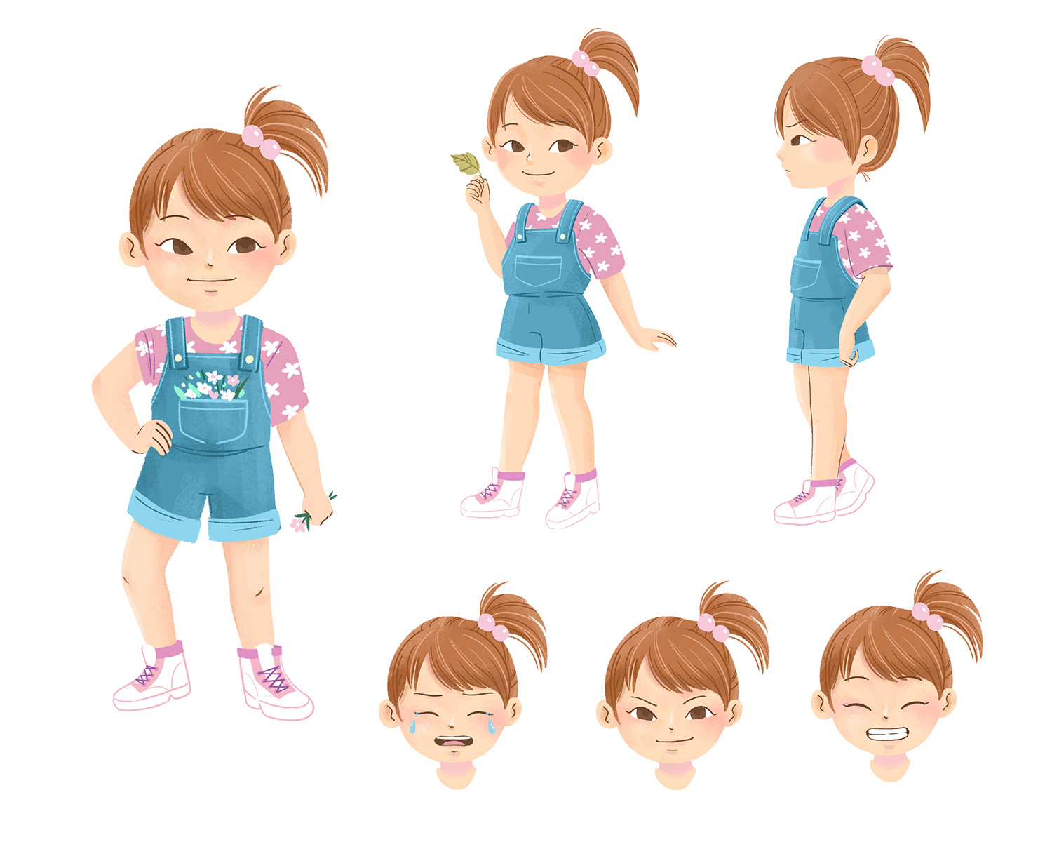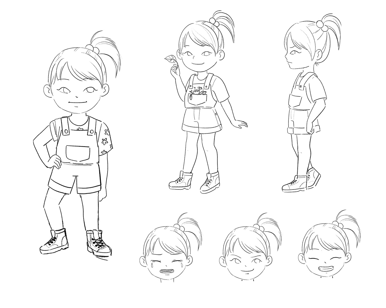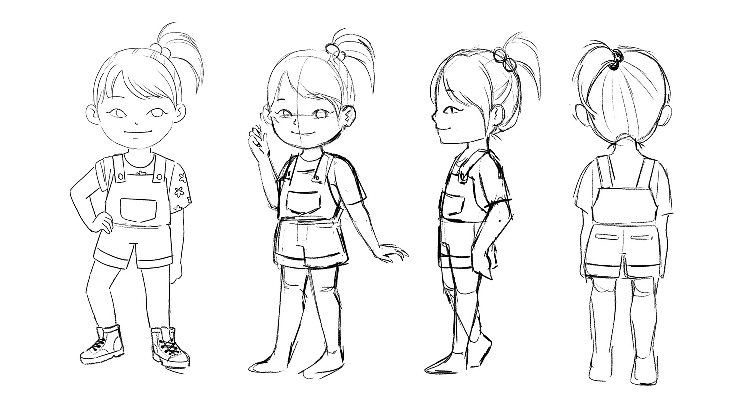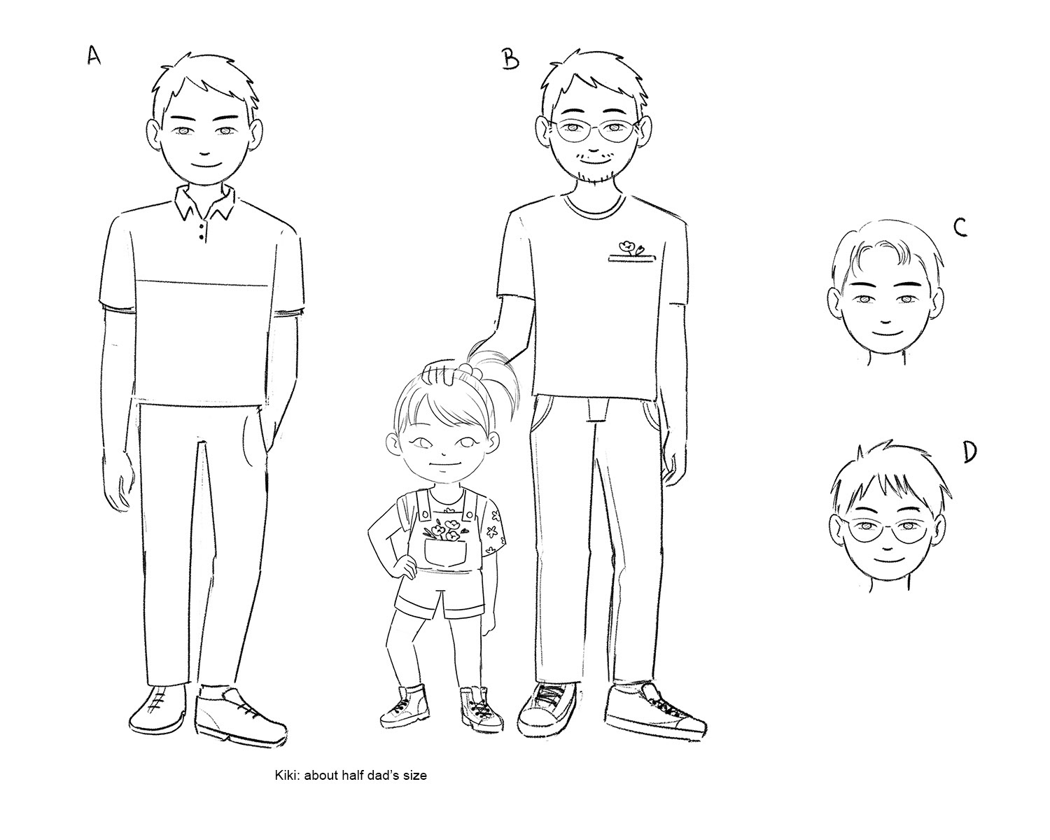 I presented 3 versions for Kiki: A, 3-4 years old, cute hairstyle and delicate clothes; B, 4-5 years old, with simpler, neutral-gendered clothes; C, 6-7 years old, more independent (she makes her own hairstyle), explorer.